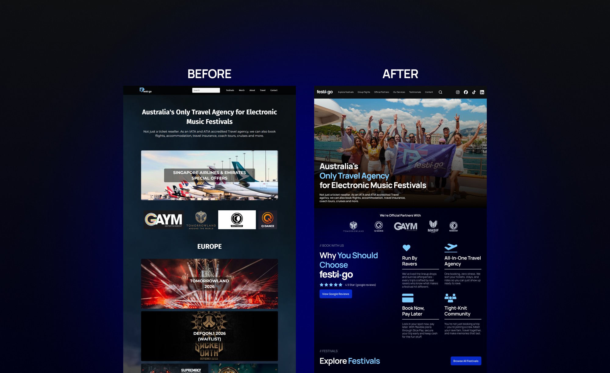 Rebranded the website with updated colours, typography, and visual assets to better reflect the energy, community, and credibility of Festigo Travel.